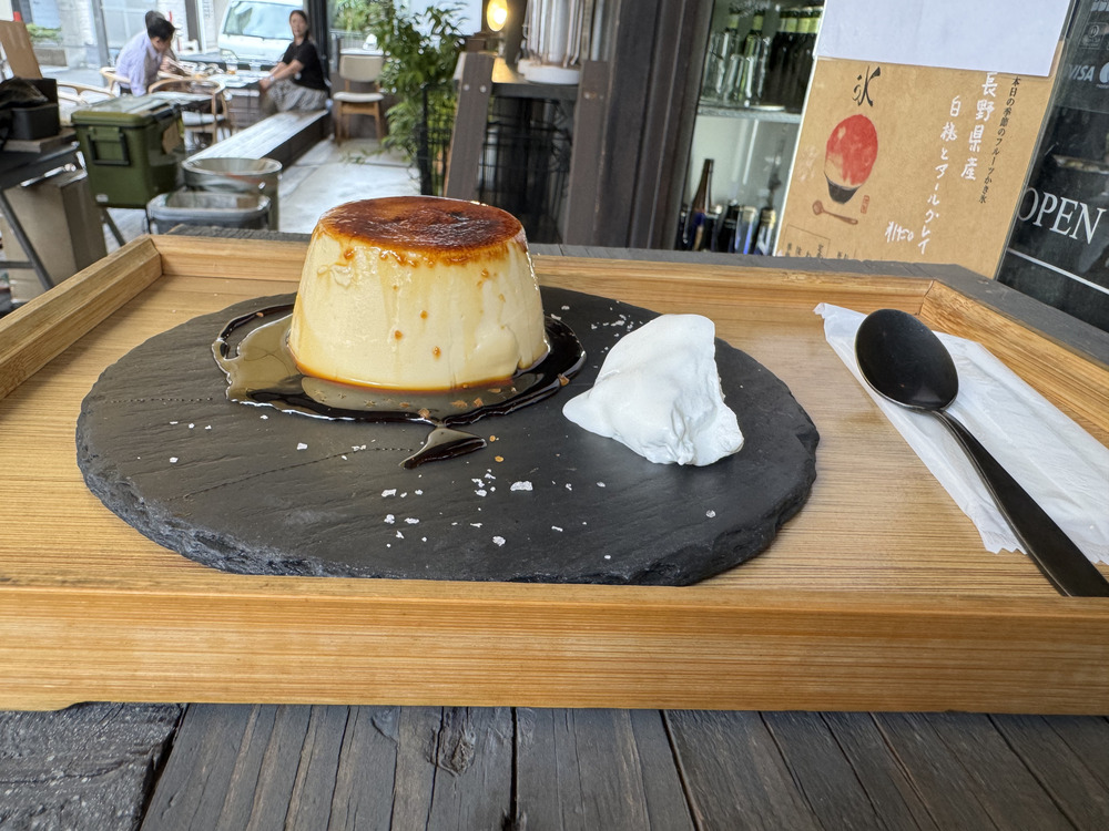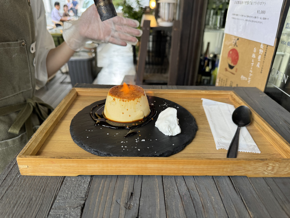 目の前で炙ってもらえる、濃厚なうみたてたまごのプリン
