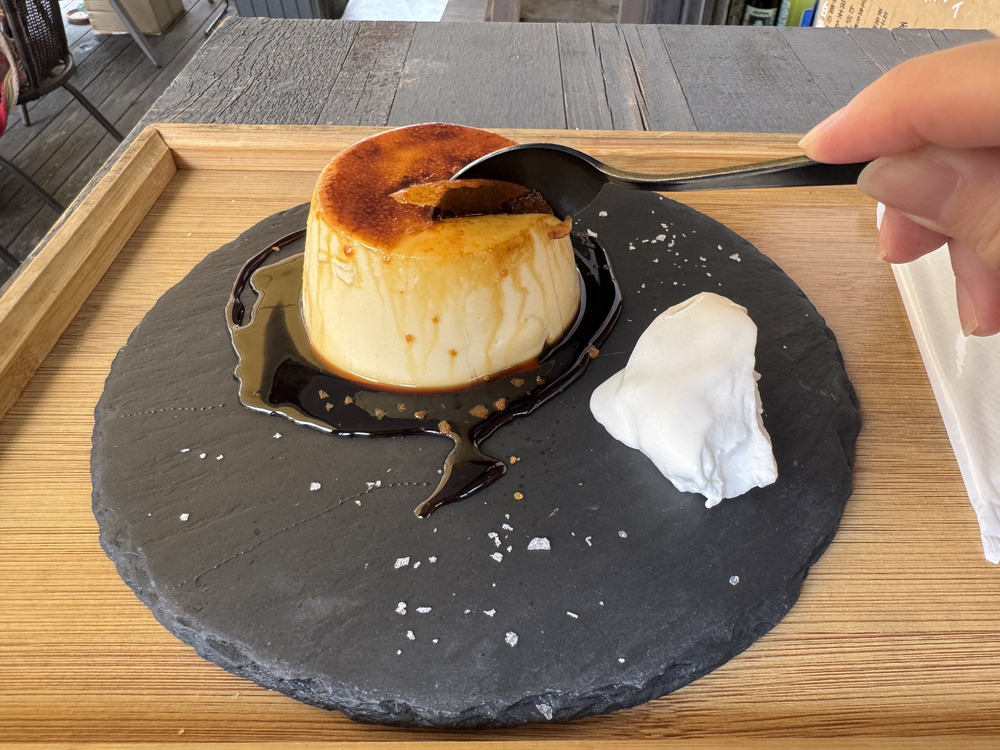 カラメリゼされたあとのパリパリした食感と、濃厚なプリンとのコントラストが楽しめます。