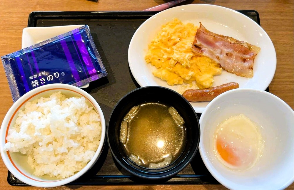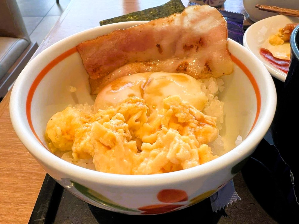 さんざん迷った末、今回は和食ベースに決定。ごはん・みそ汁セット(温泉卵付き)を選びました。さらにスクランブルエッグも追加して、贅沢なW卵モーニングに。