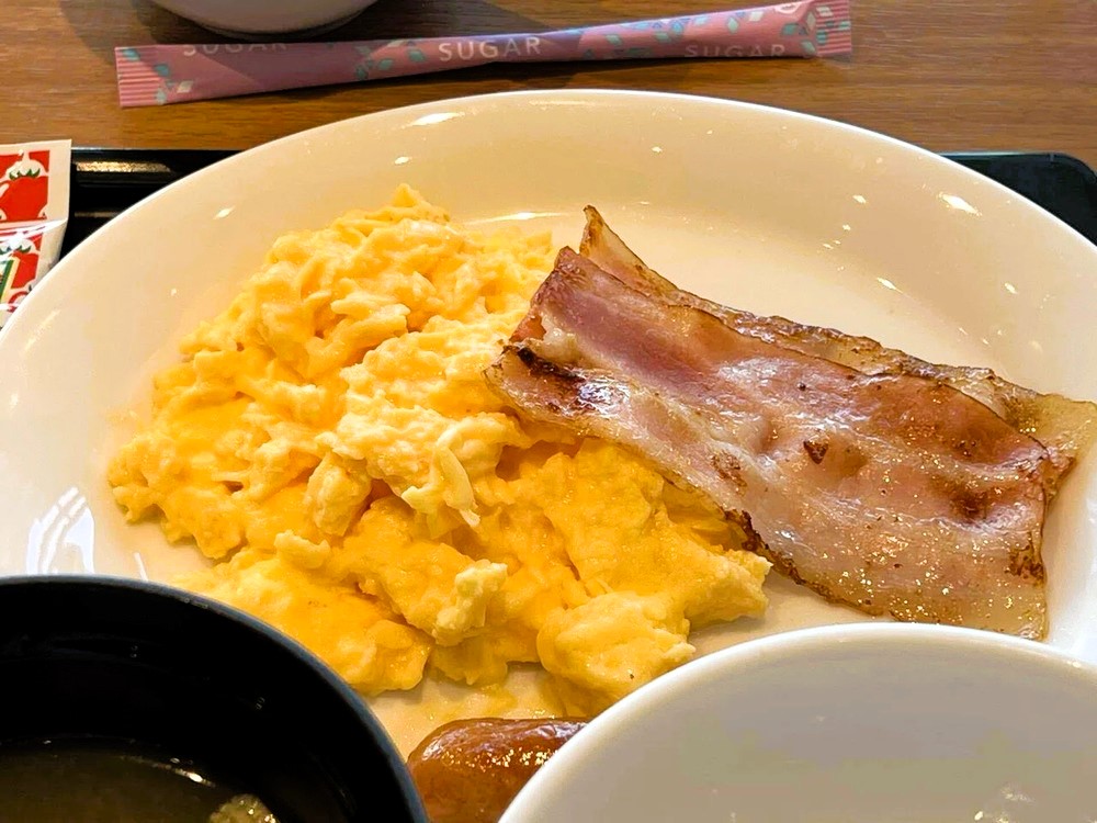 スクランブルエッグには、ベーコンとウインナーが添えられています。