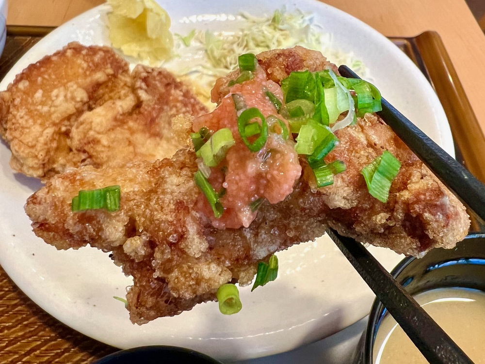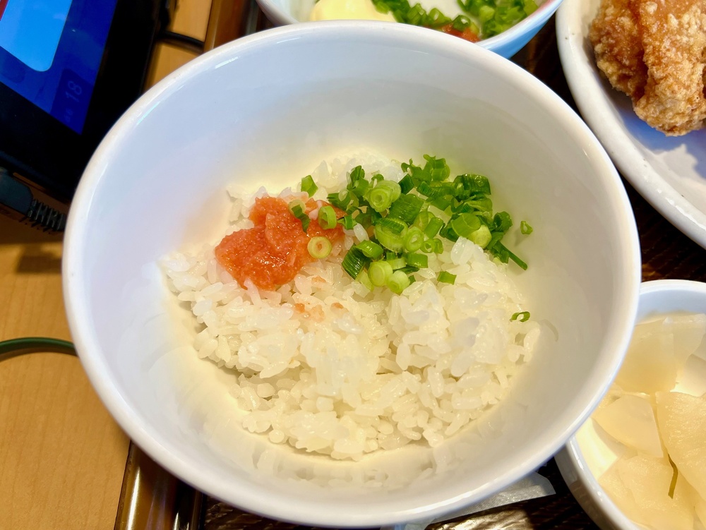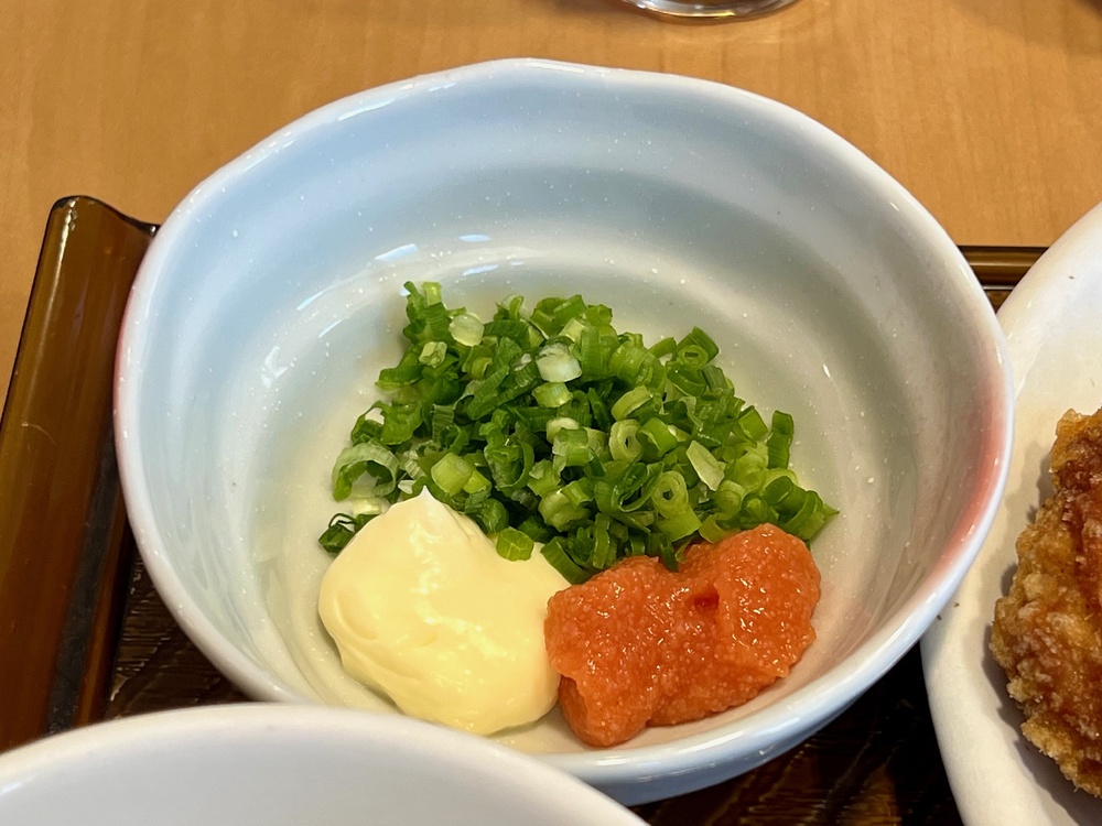 から揚げはそのままでも十分おいしいのですが、小ねぎと明太子をトッピングすると、またちがったおいしさが楽しめました。