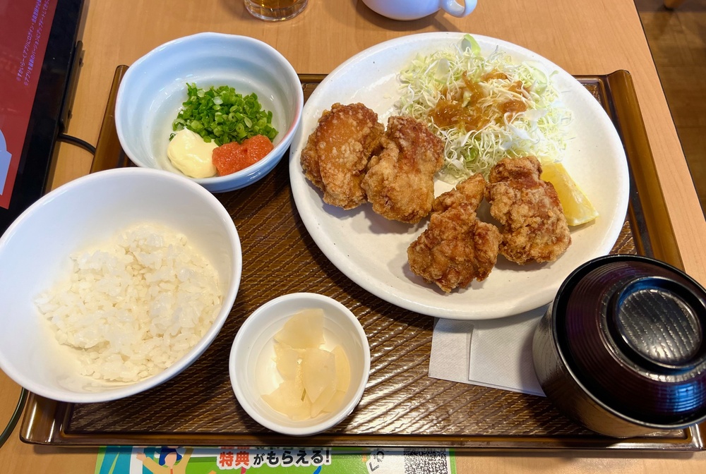 悩んだすえに私が注文したのは、博多のもつ鍋店「やまや」が監修した、博多明太から揚げ定食の4個(※時期により販売していない可能性がございます)と、ドリンクバーのセット。