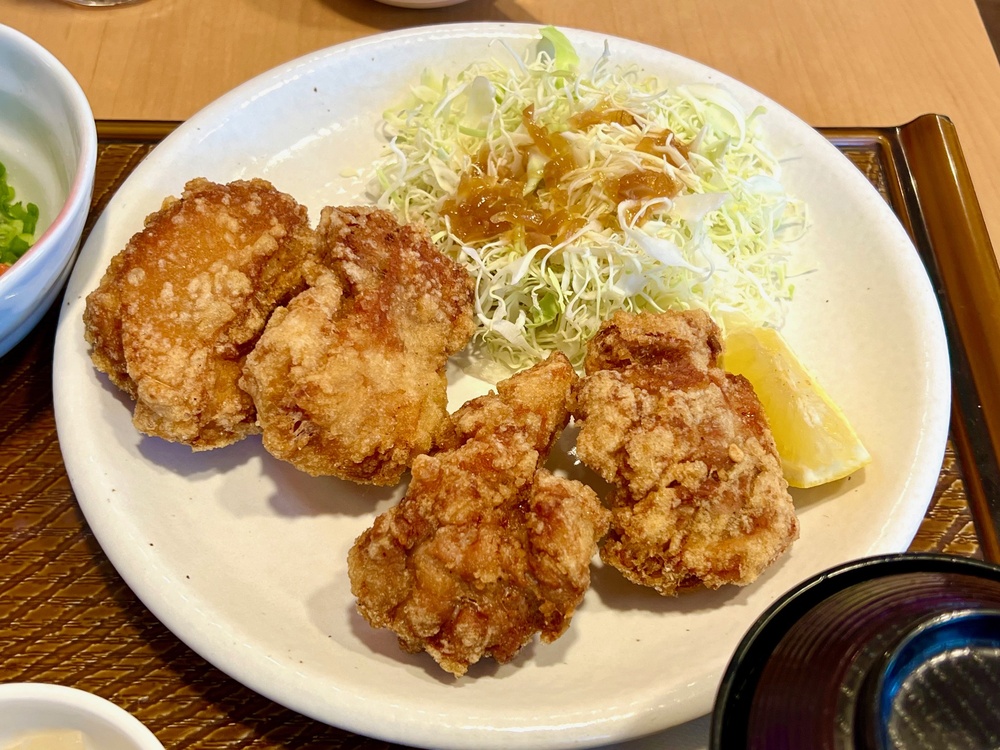 ごろっとちょうどよいサイズのから揚げが4個。レモンが添えられていて、キャベツにはドレッシングがしっかりかかっています。