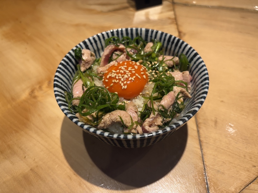 濃厚な卵黄を崩し、鴨ささみと九条ねぎに絡めていただきます。甘辛い特製ダレが絶品で、箸が止まらずあっという間に完食してしまいました。