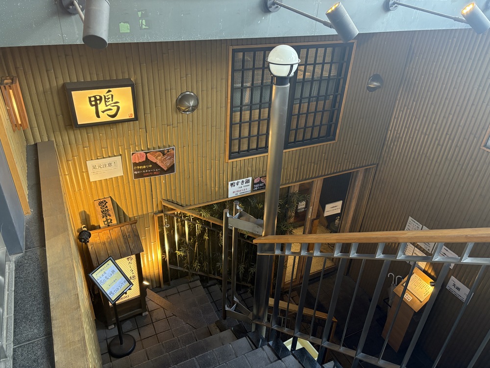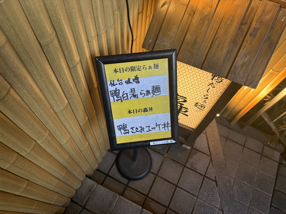 階段の途中には、限定メニューを紹介した看板。私が訪れた時期は仙台味噌鴨白湯らぁ麵と鴨ささみユッケ丼が提供されていました。