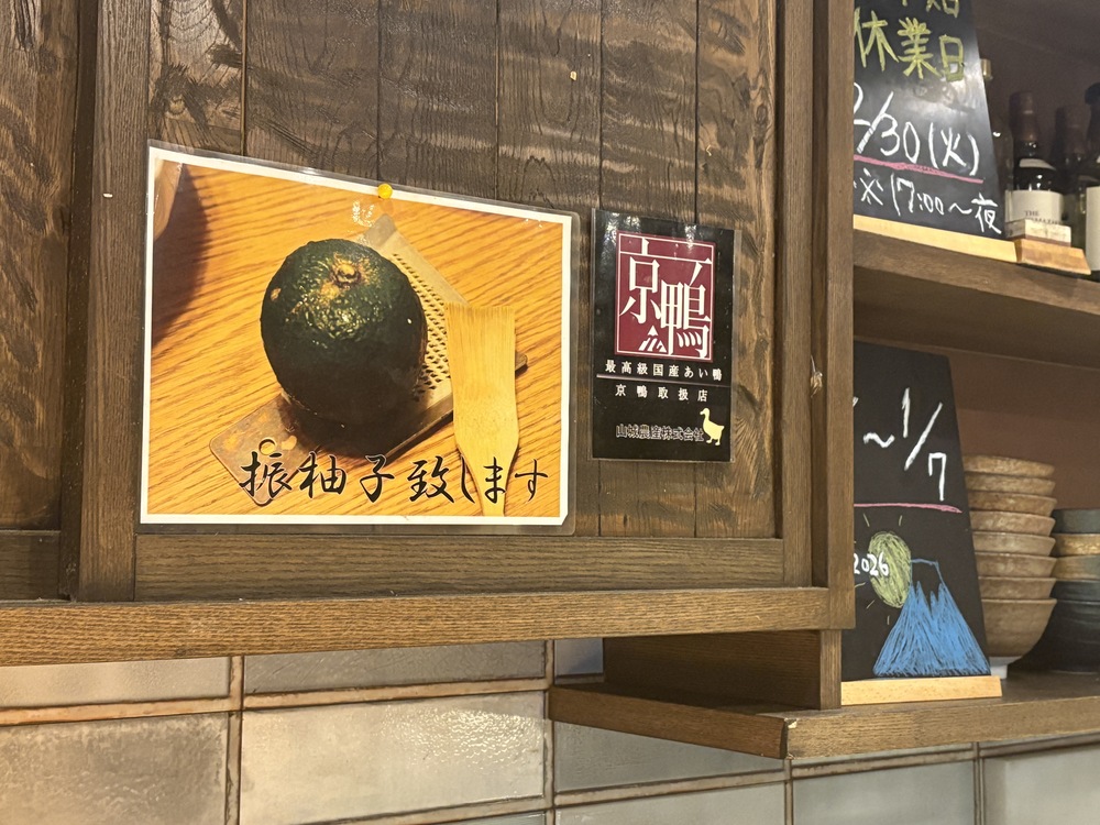 壁には最高級国産合鴨・京鴨取扱店の証が掲げられており、素材への並々ならぬこだわりが伝わってきます。