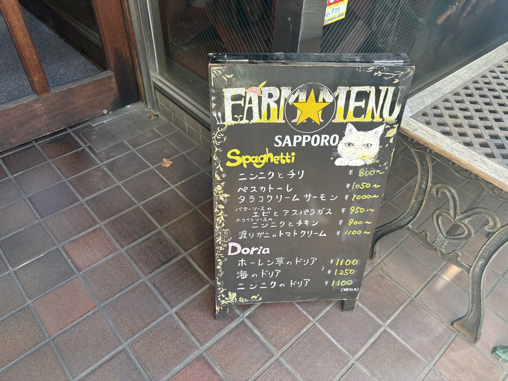 ランチメニューが書かれた看板もあり、パスタやドリアの内容を事前に確認できるのも安心です。