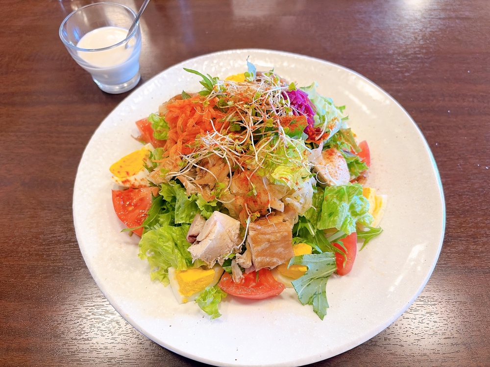 大きめのボウルにたっぷりと盛られたサラダは、彩り豊かな野菜が主役。シャキシャキとした食感の新鮮野菜に、食べ応えのある具材がバランスよく組み合わさり、しっかり満足感があります。