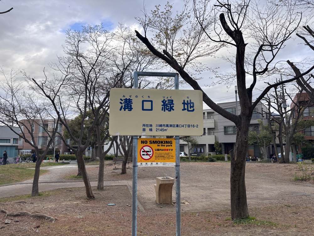 訪れて最初に目に入るのが、溝口緑地の看板です。