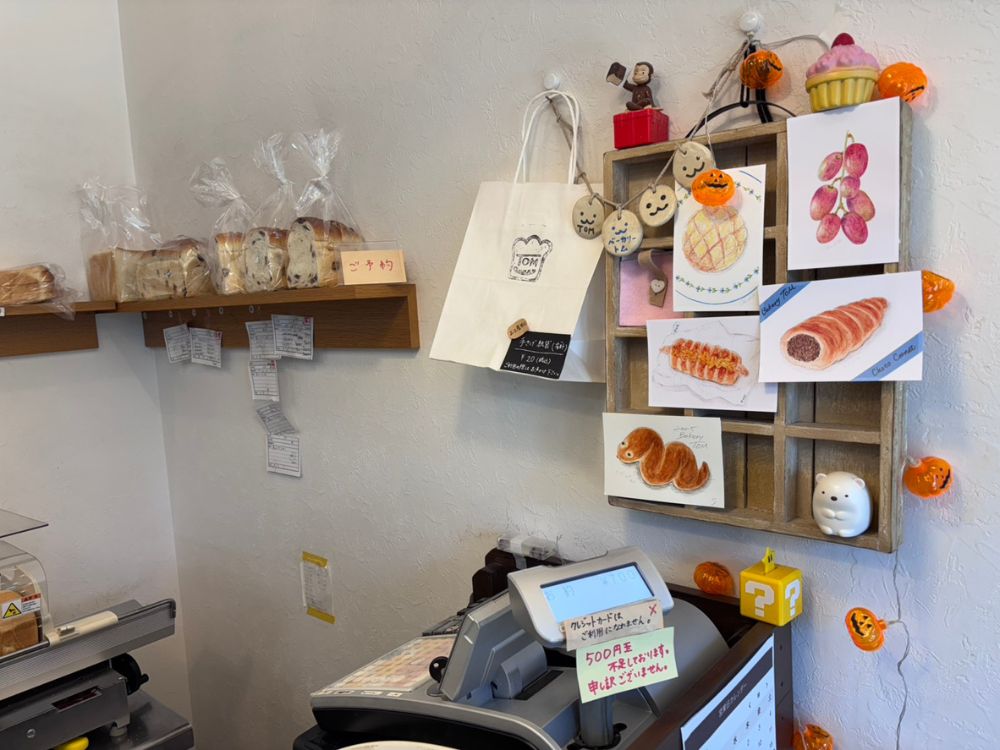 レジ付近には、かわいい装飾の中に紛れて予約のパンが置いてありました。