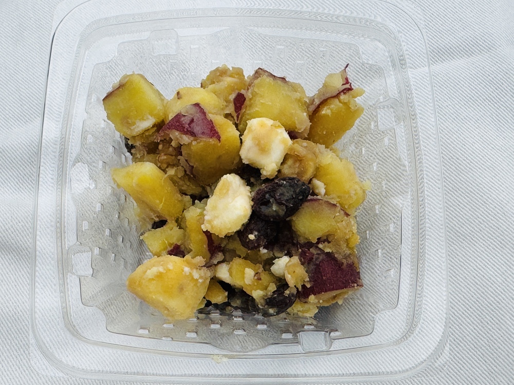 日替わりのお惣菜だったさつまいものクリームチーズあえは、レーズンの酸味とくるみのアクセントが効いた一品。