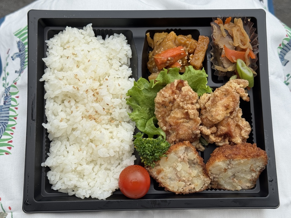 今回は、大きなコロッケに惹かれて「コロから弁当」をチョイス。天気が良かったので、帰り道の公園でランチにしました。