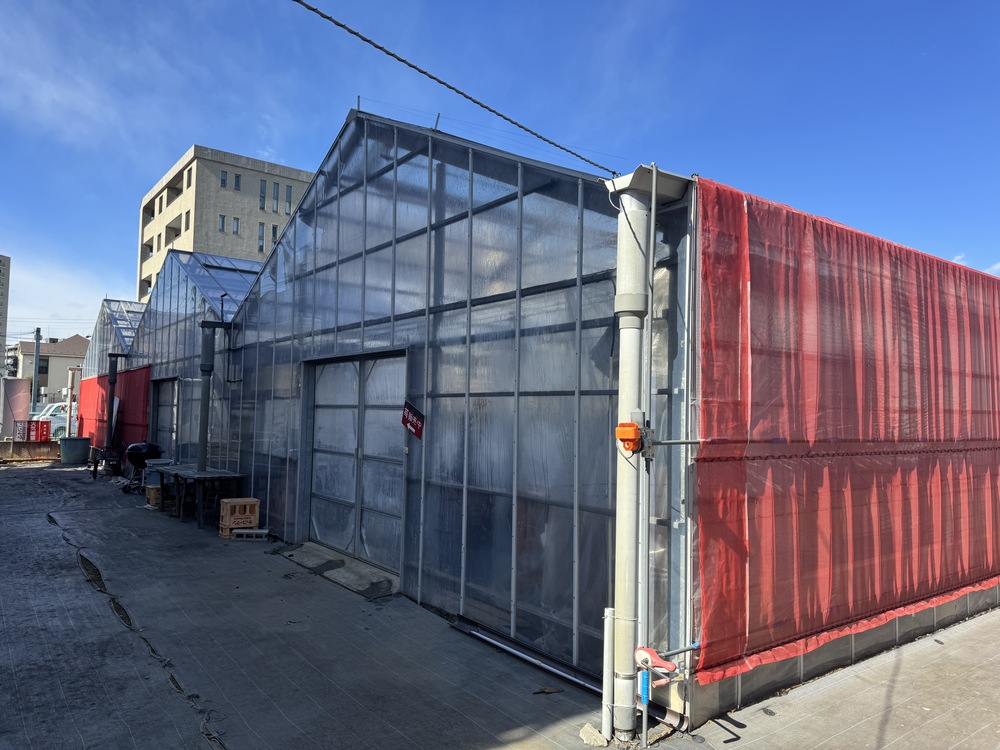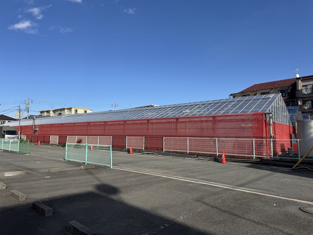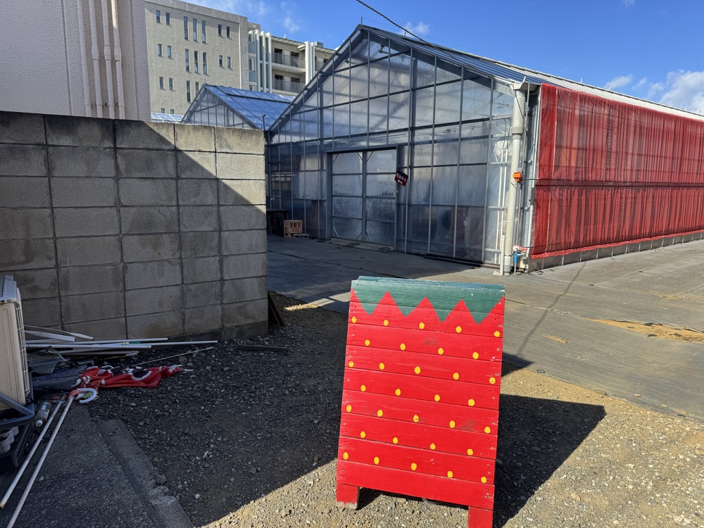 駅付近の喧騒から離れた住宅街を歩いていると、いちごカラーのビニールハウスに出会いました。