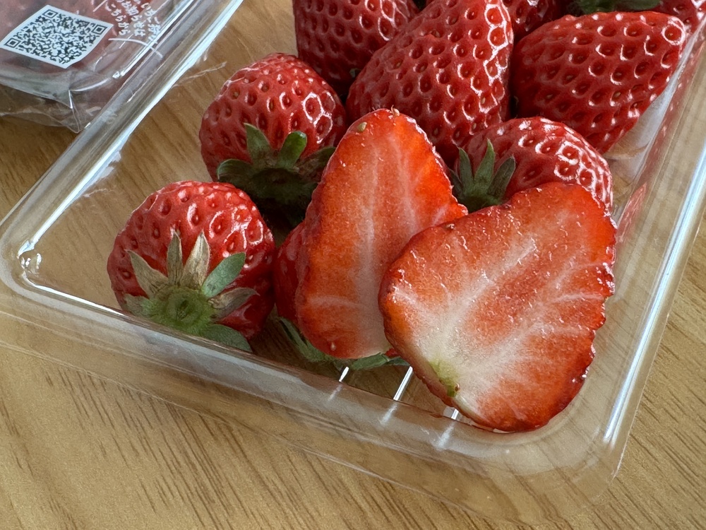 きれいに並んでいるので、少しもったいない気もしましたが、さっそく購入したいちごをいただきました!パックの中には、ヘタの際まで真っ赤に染まった完熟のいちごがぎっしり。