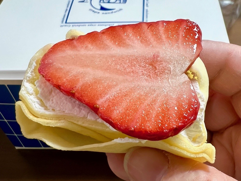 通常の筒状にくるくる巻いてあるクレープとは異なり、二つにカットされ断面に具材(フルーツ等)がのぞくその形は、まるでサンドウィッチ!