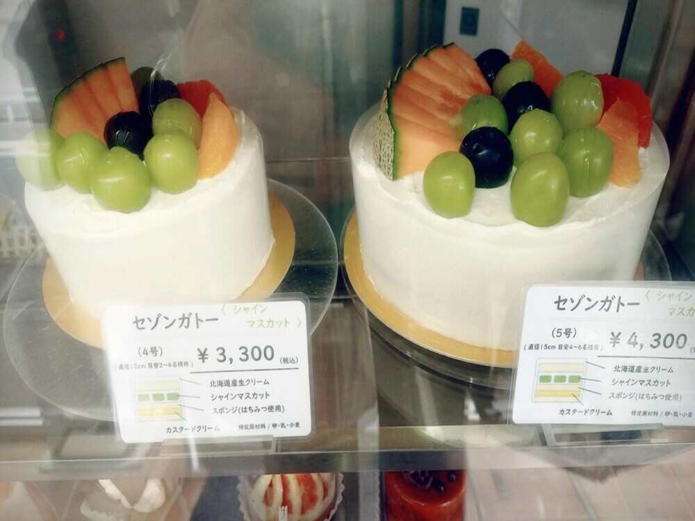 ショーケースをのぞくと、まず目を引くのが鮮やかなフルーツケーキ。シャインマスカットやイチゴ、メロンなど、旬のフルーツがたっぷりと盛られています。