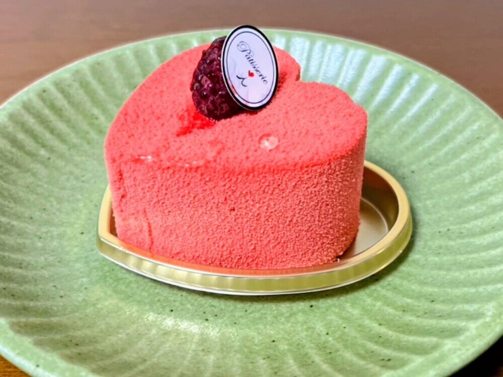 ハート型の赤いムースケーキ「アイ」は、ホワイトチョコレートムースとフランボワーズを組み合わせた人気の一品です。