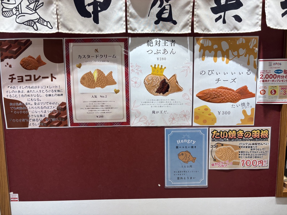 甲賀米粉たい焼きは、とにかくメニューの種類が豊富。